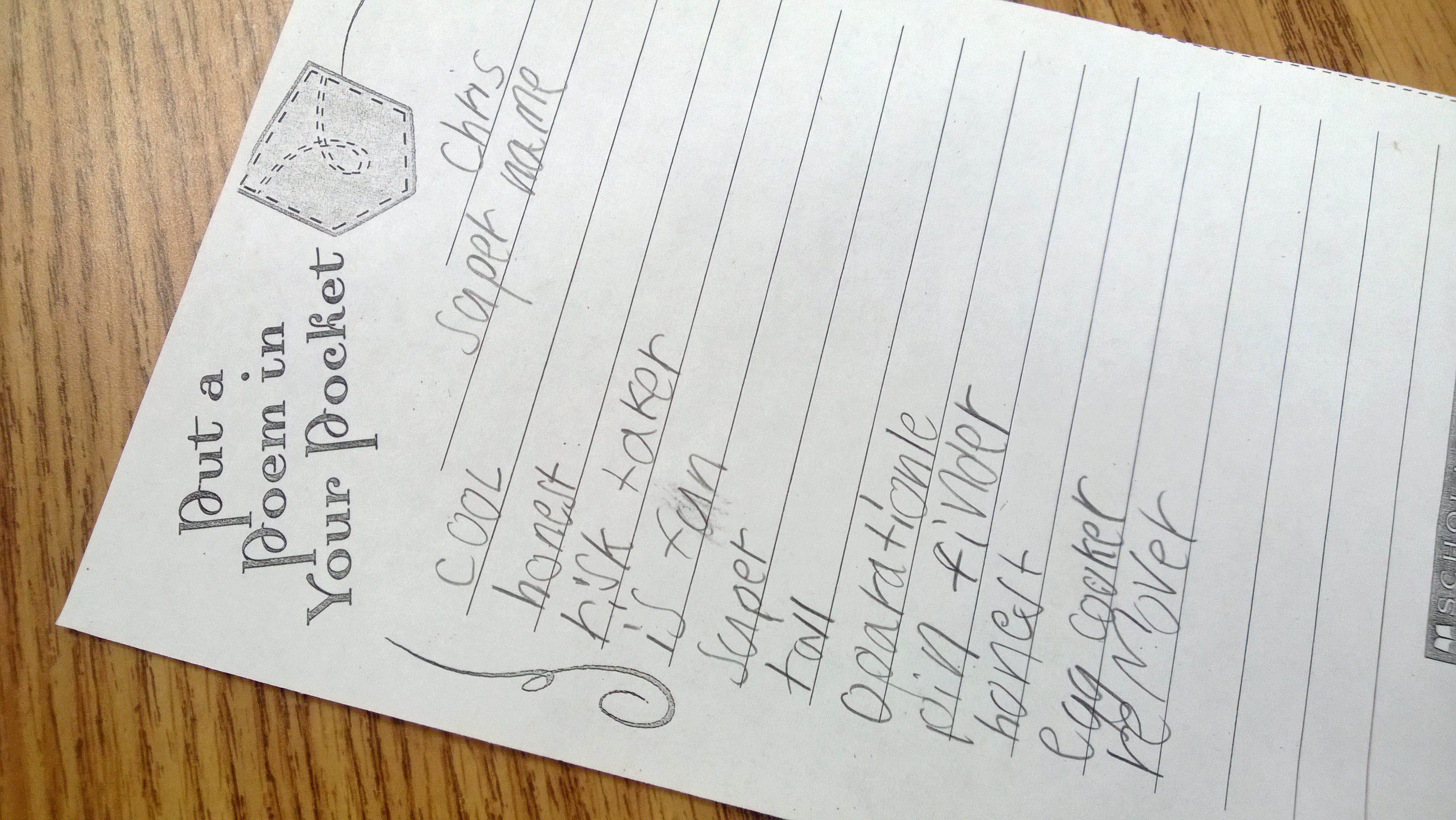At my two Montgomery County, Maryland elementary schools, we celebrated Poem in Your Pocket Day on April 18th and 19th at Brookhaven ES, and April 19th and 22nd at Clopper Mill ES. We had the opportunity to share some wonderful poems with each other, and were able to Skype with several schools throughout the USA. Using templates from Homeschool Creations and Scholastic, my students wrote original poems or copied a favorite poem to share.