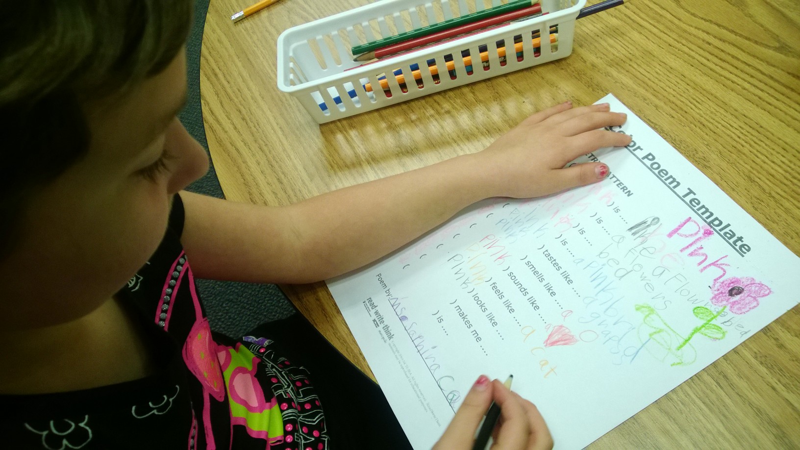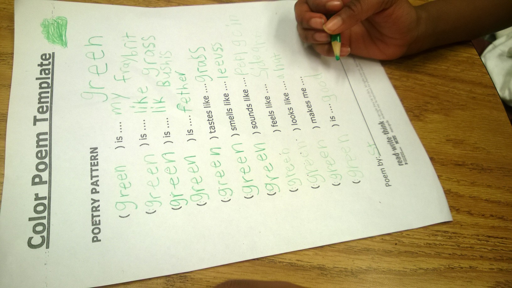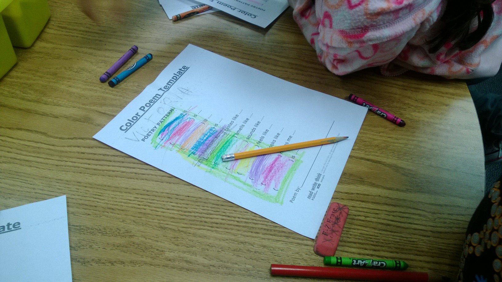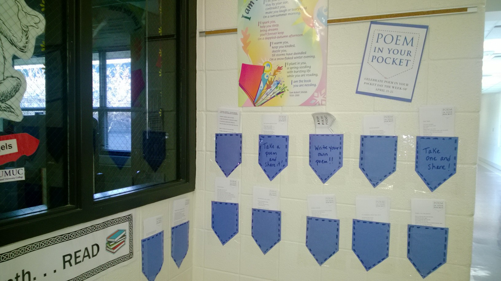 Between my two schools, we participated in Poem in Your Pocket Week with hands-on exploration of various forms of poetry:  Acrostic, Haiku, Black-Out were just a few of them.