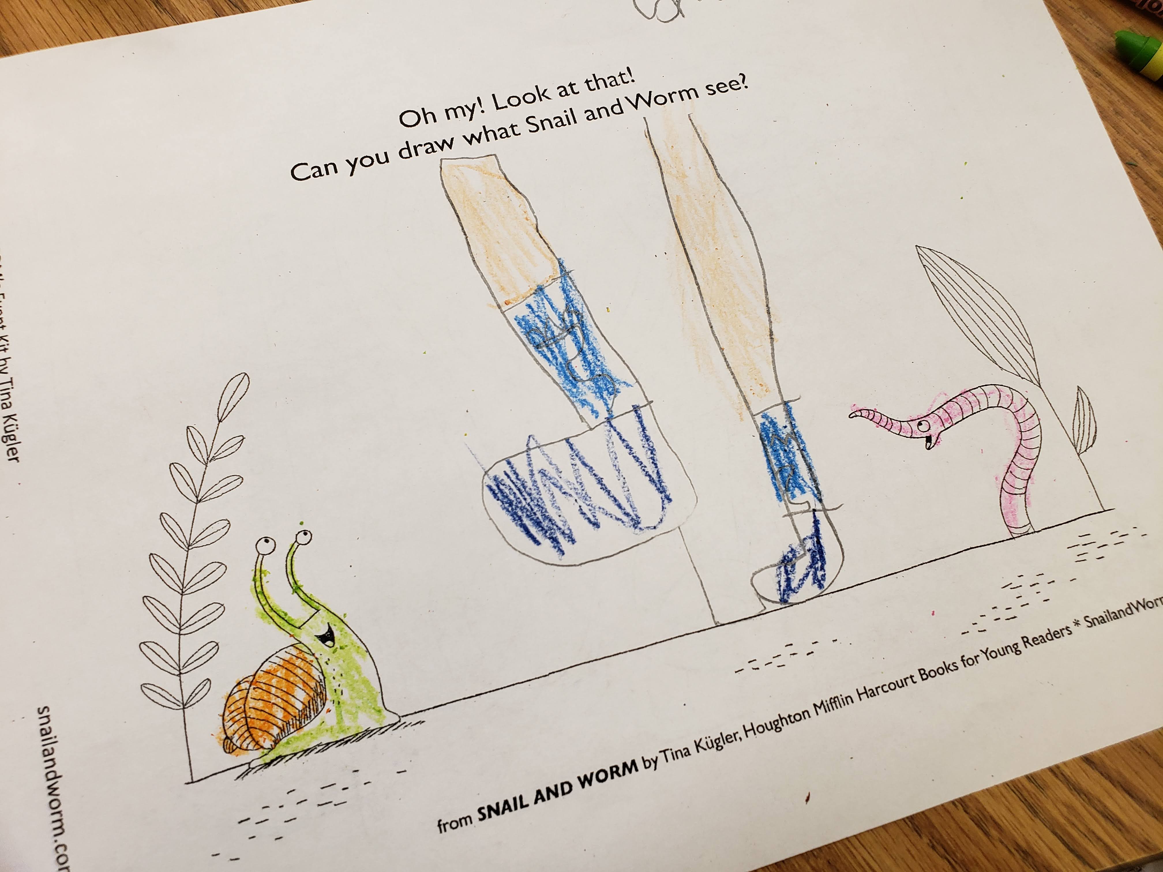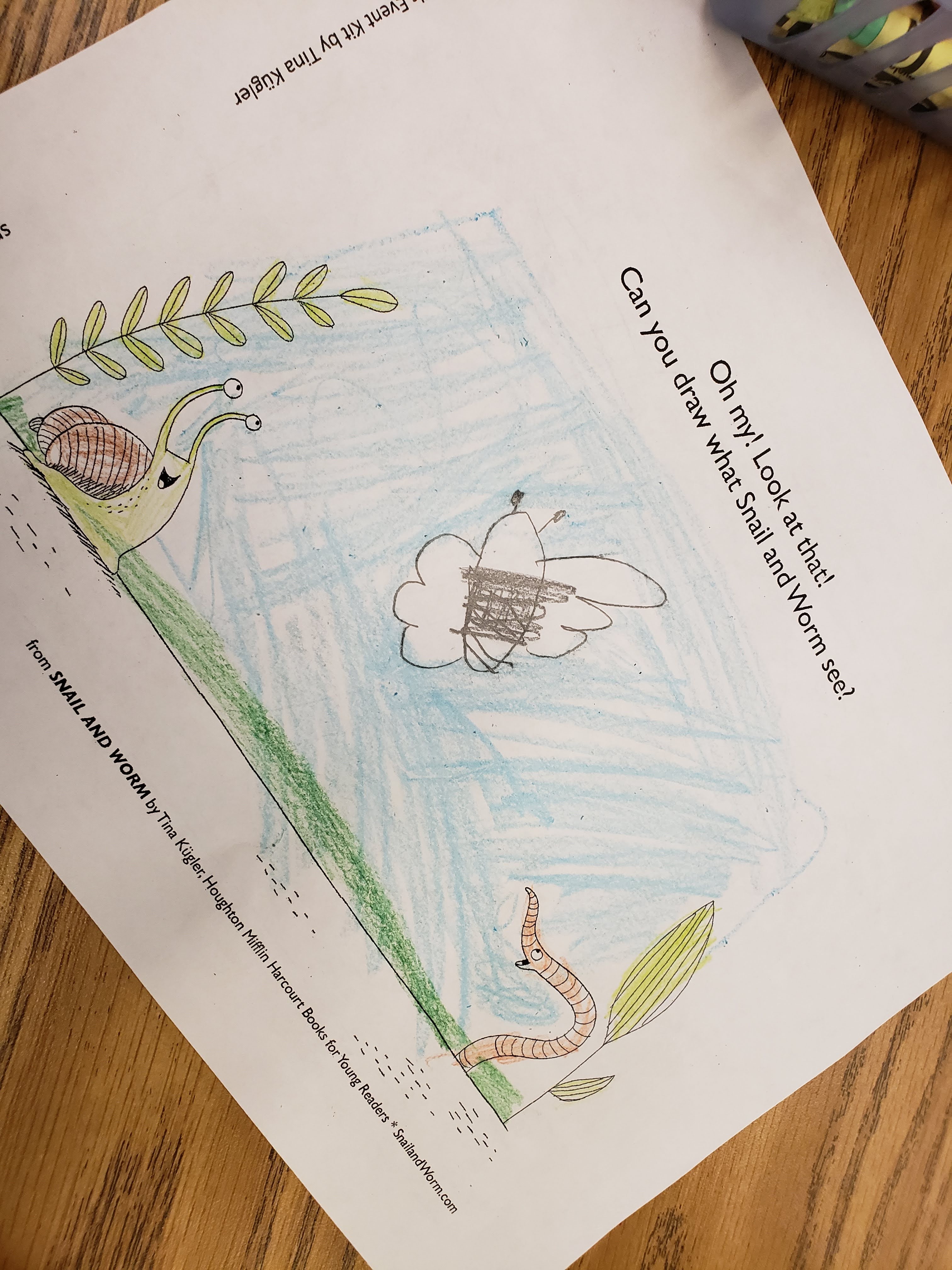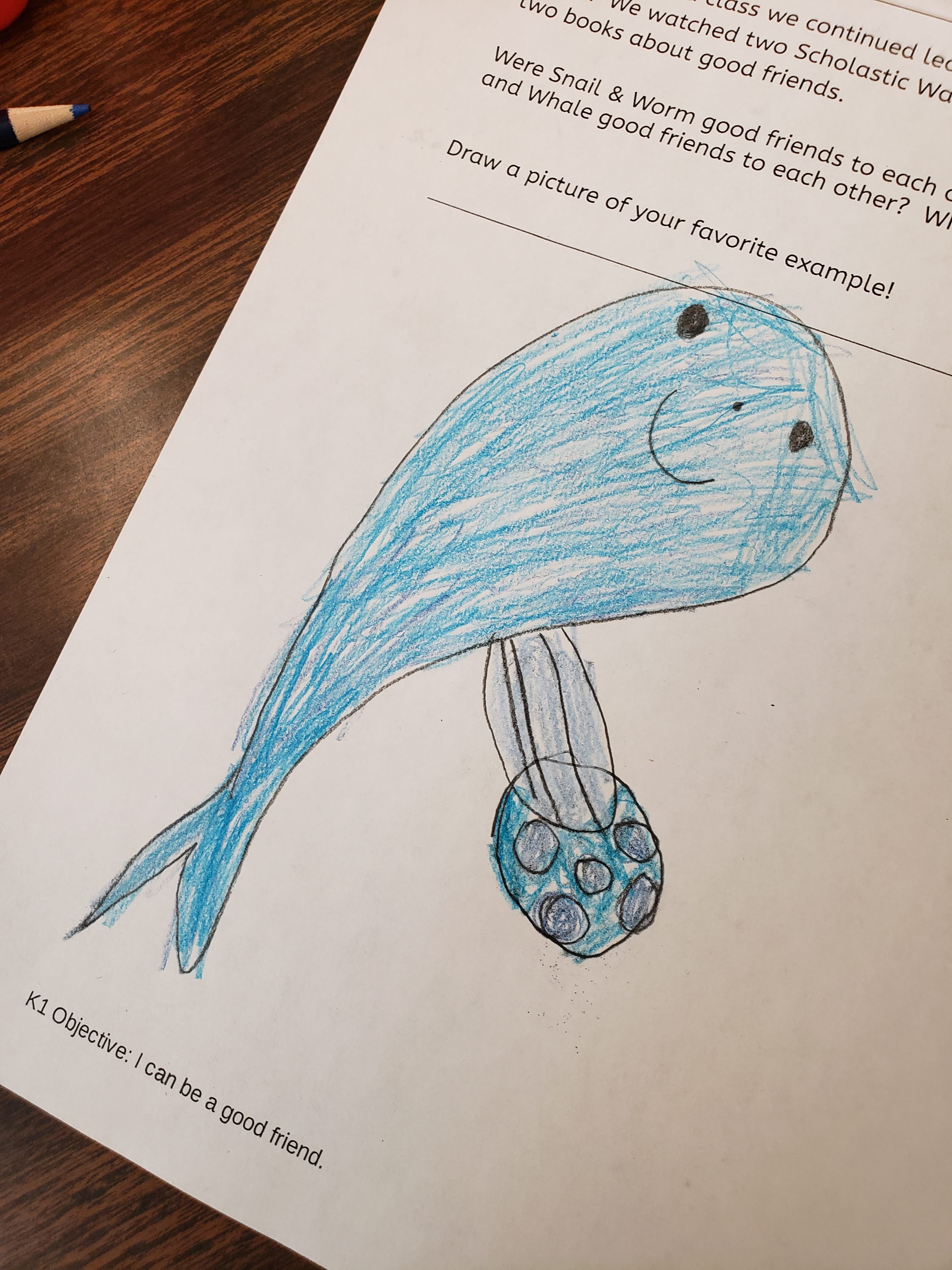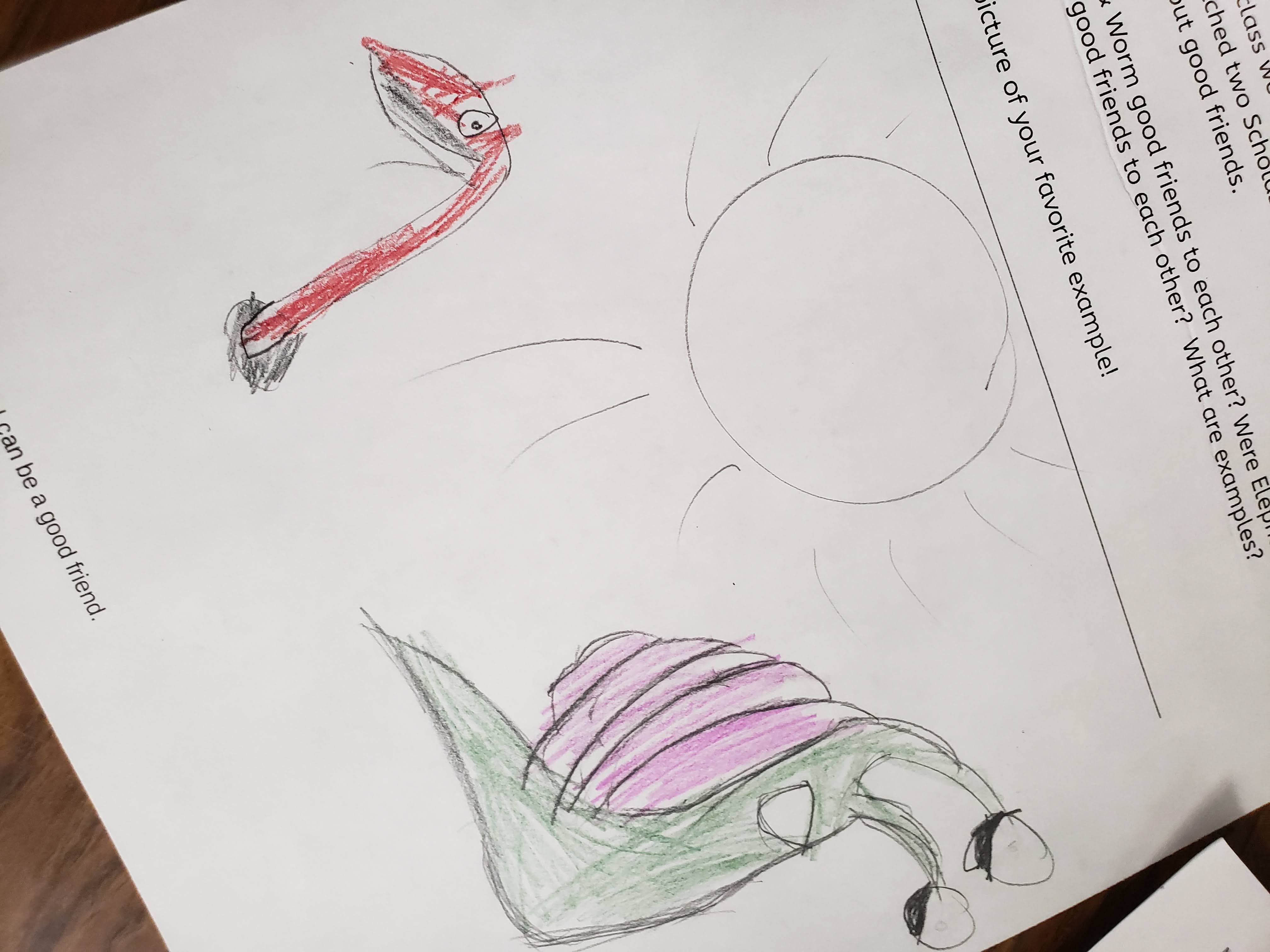 The first week, my lesson was entitled, “What is Friendship?” and the big question was, “What does it mean to be a good friend?” In the lesson I used the wonderful PebbleGo article, Making New Friends, and the books My New Friend is So Fun! by Mo Willems and Snail and Worm Again by Tina Kügler. My students and I had insightful discussions about friendship and specific ways in which the characters were good friends to each other. We also had a great time creating snail art!