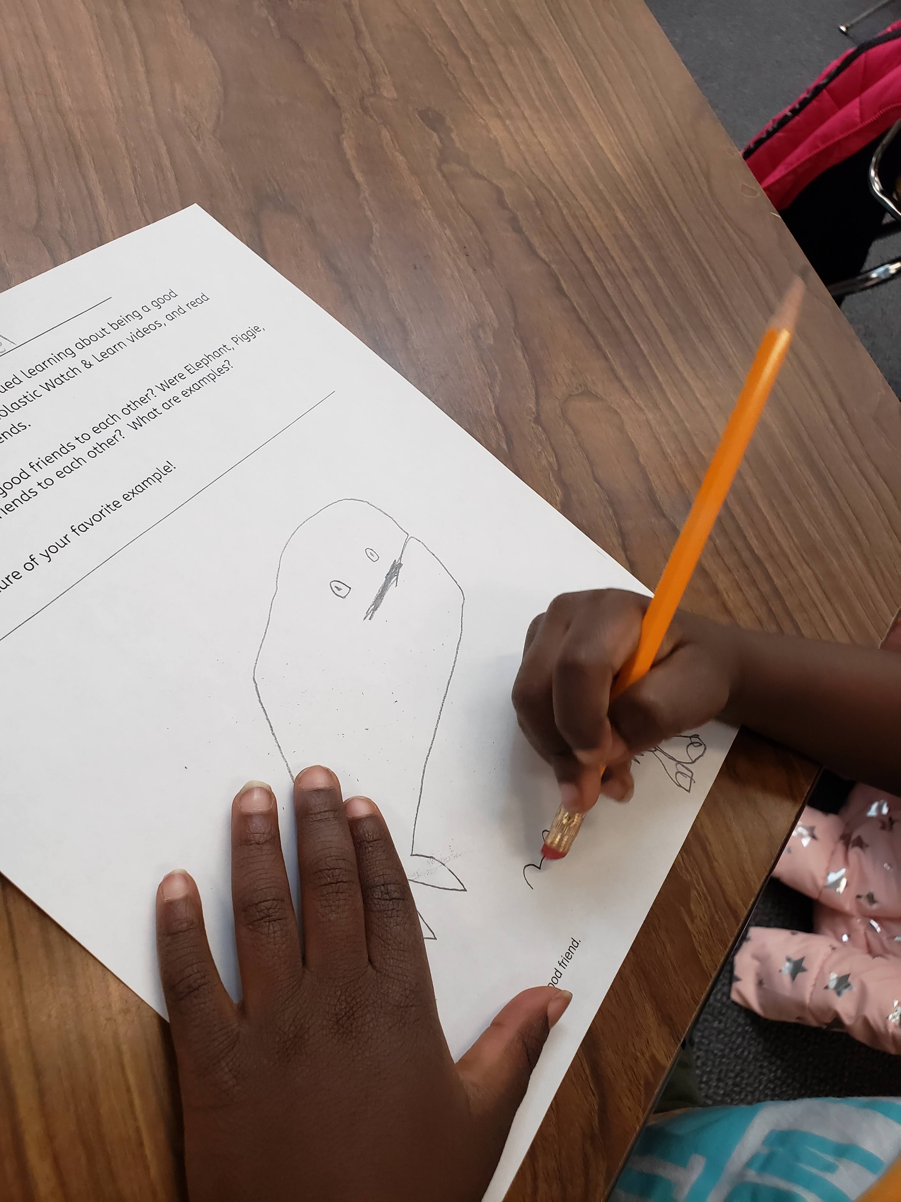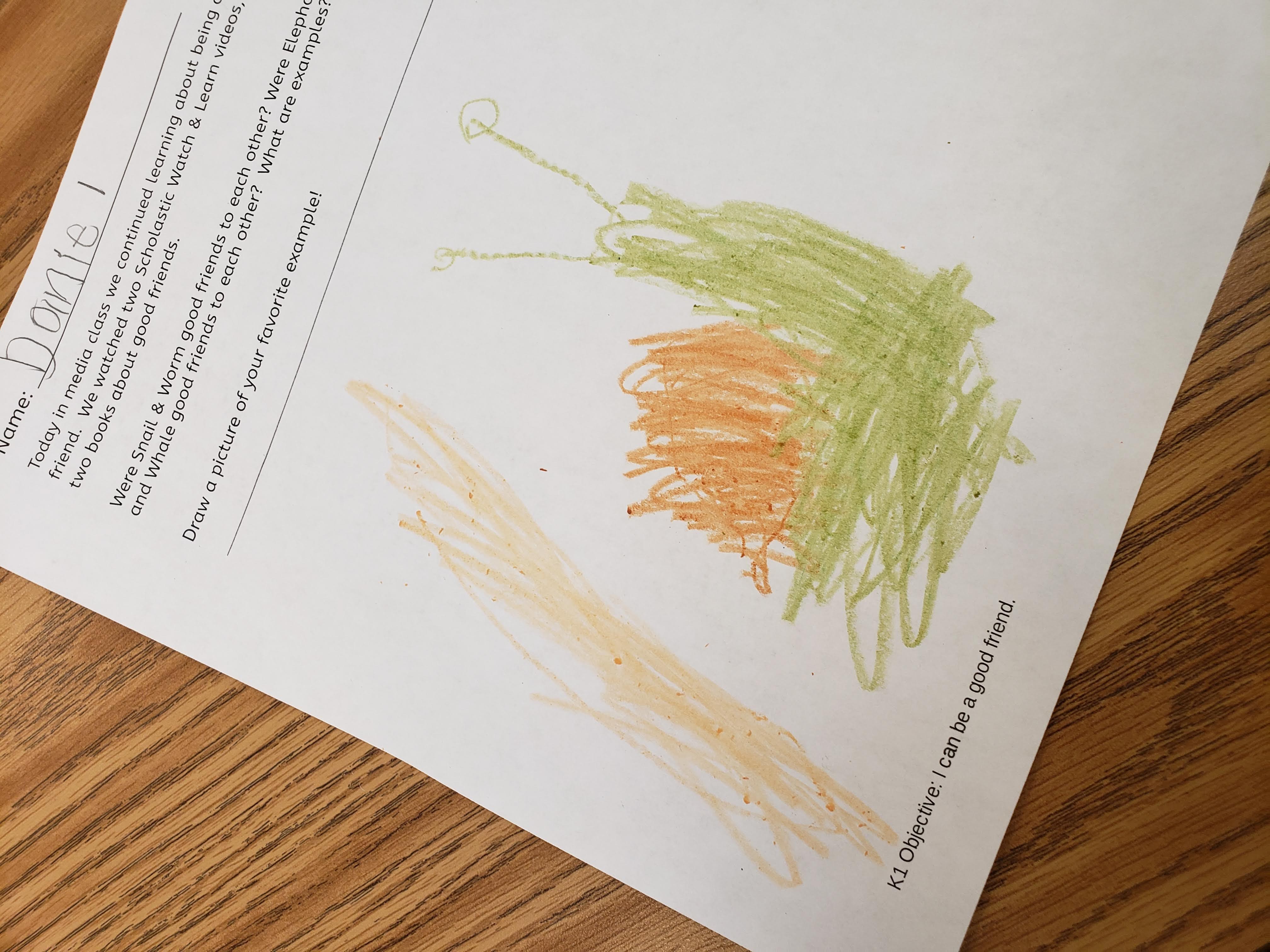 The second week, my lesson was entitled “Be a Fantastic Friend” and we continued exploring what it means to be a friend. Scholastic Watch & Learn has two wonderful friendship videos: Fantastic Friend Countdown and Can You Be a Good Friend? which gave my young students some concrete examples of things that they could do in the classroom and at recess. The books I incorporated were again by author/illustrators Mo Willems (The Big Guy Took My Ball!) and Tina Kügler (Snail and Worm). I love that my young learners appreciated the humor in each of these books and laughed out loud at the characters’ silliness, while also understanding the message of friendship in each.