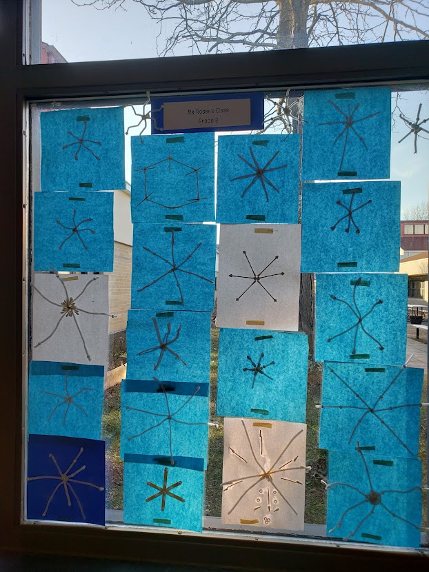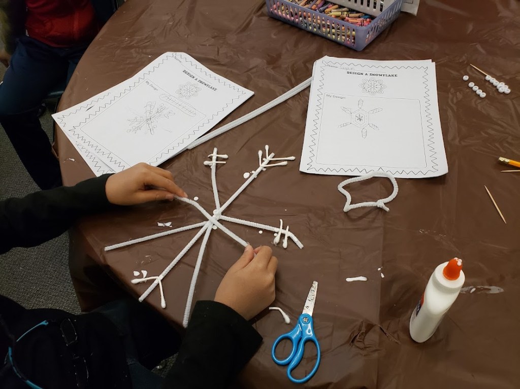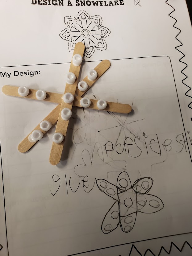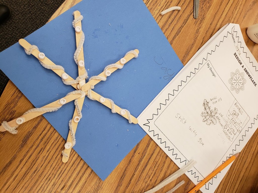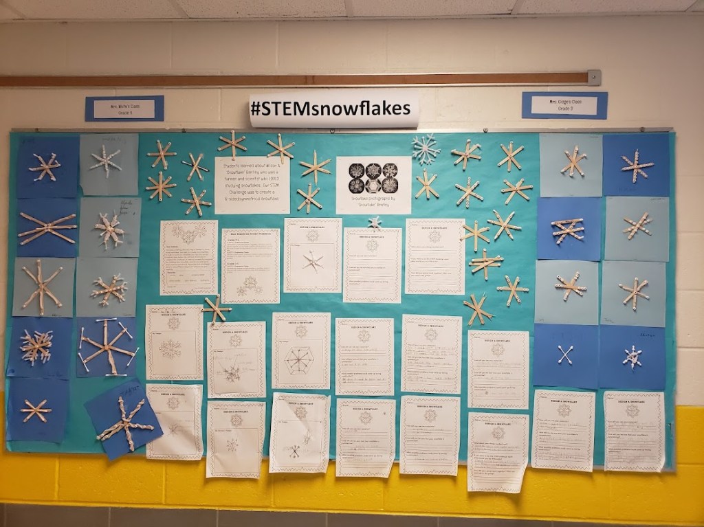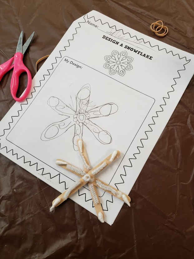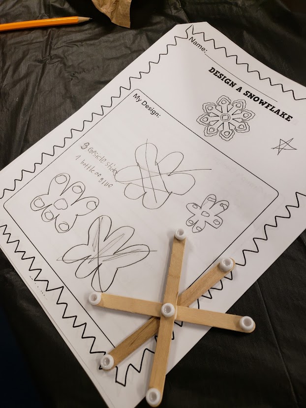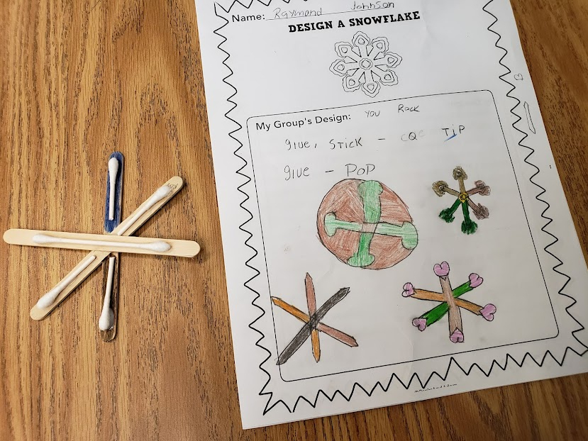 Because I wanted to make a hallway display of their snowflakes, I combined the two challenges and shared them with my 3rd and 4th grade students. It was a multi-week lesson. During the first lesson, we read Snowflake Bentley, studied some of Bentley’s photos, and watched videos about Wilson’s photography and the process of snowflake creation. In the second lesson we reviewed symmetry, watched a video about high-speed snowflake photography, and began the snowflake design process. In the last lesson we reviewed the engineering design process to allow my young engineers plenty of time to design, reflect, and create their snowflakes.