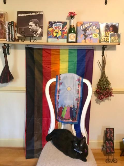 At the opening of my office, you’ll see a homage to feminine divine energy, a goddess with a crown of candles. Step further into the soft blue light and you’ll pass my altar to my ancestors, trickling with flowers. Across from my standing desk are two old school black chalkboards with outlines for a current middle grade novel-in-progress currently titled Crescent Dances with the Stars. Occasionally a beloved bow-tied kitty warms my chair.