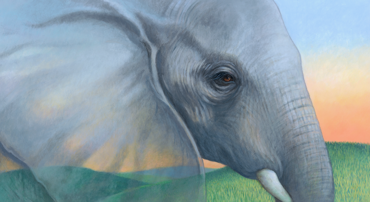 After painting several versions of the cover illustration, I finally succeeded in giving Nana’s elephant eye the contemplative feeling that I was striving for. I painted the South African landscape to show through her image to convey a feeling of mystery and to reinforce how elephants are a part of the land. The illustrations were created with acrylic paints and Prismacolor pencils on gesso-primed Strathmore Bristol paper. I also paint in oils and tried to incorporate a painterly style in these illustrations.
