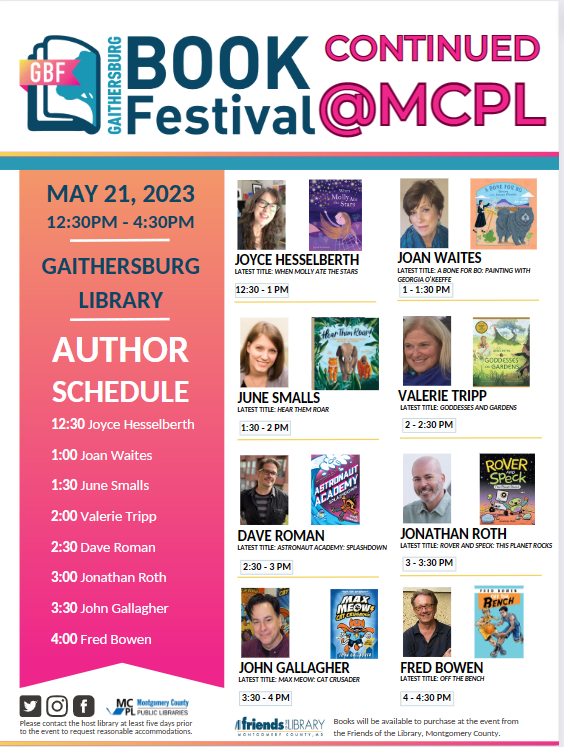 Jonathan Roth will be a featured presenter at the 14th Annual Gaithersburg Book Festival on Saturday, May 20, 2023, at Bohrer Park. He is presenting along with Jarrett Lerner and Dave Roman at 11:15 am in the Graphic Novels and Workshops Pavilion. In addition, Jonathan will be a featured presenter at GBF Continues @MCPL on Sunday, May 21, 2023 at 3:00 pm.