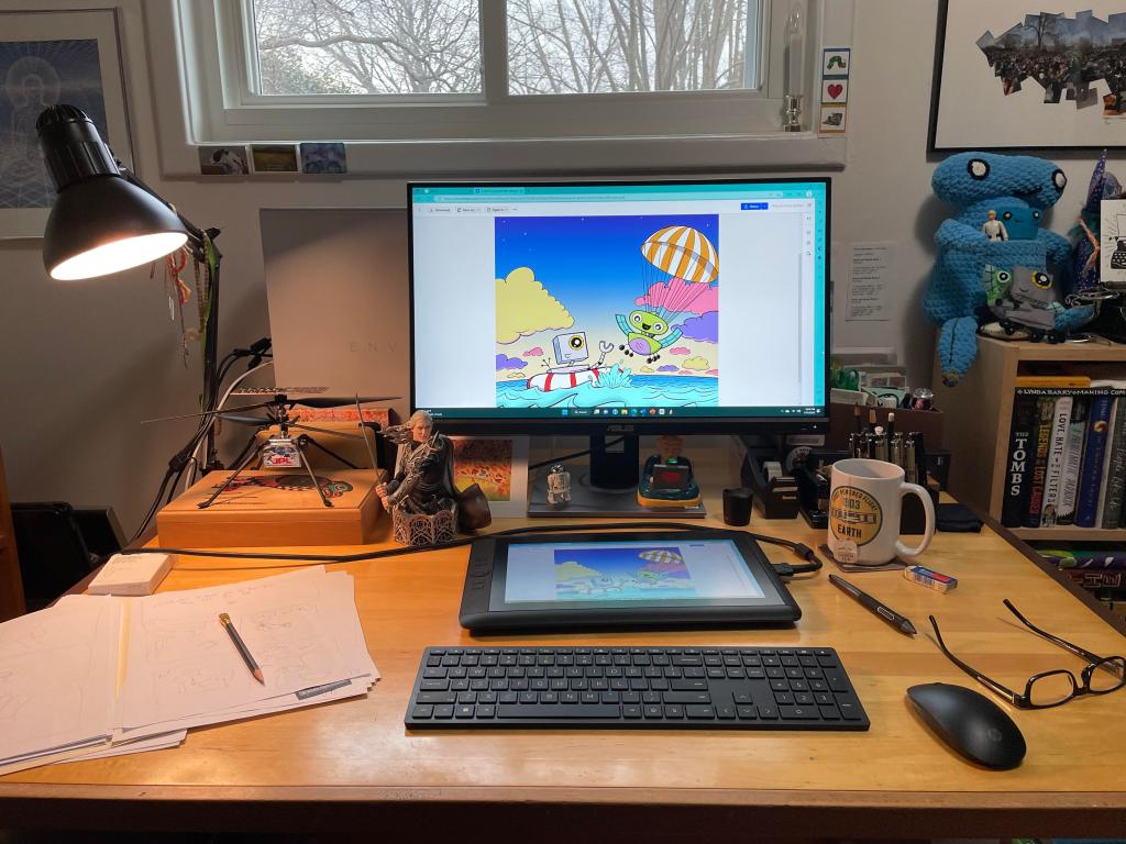 I do almost all my writing and illustrating at my desk in a little room in my home in Twinbrook, Rockville.